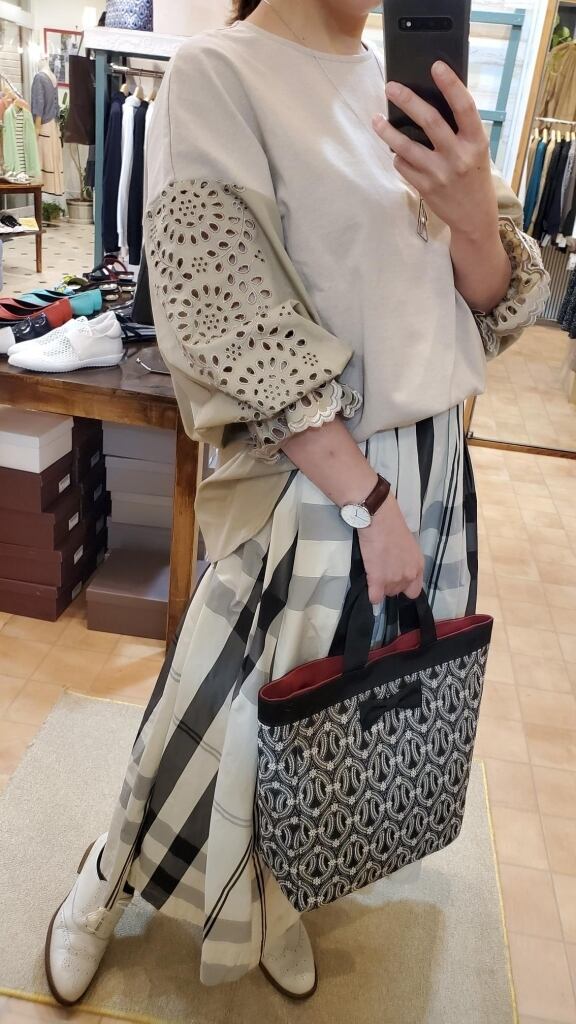 ゴム入りのお袖で、長袖をキュッと上げて七分袖で軽く、早い時期から楽しむことができます。