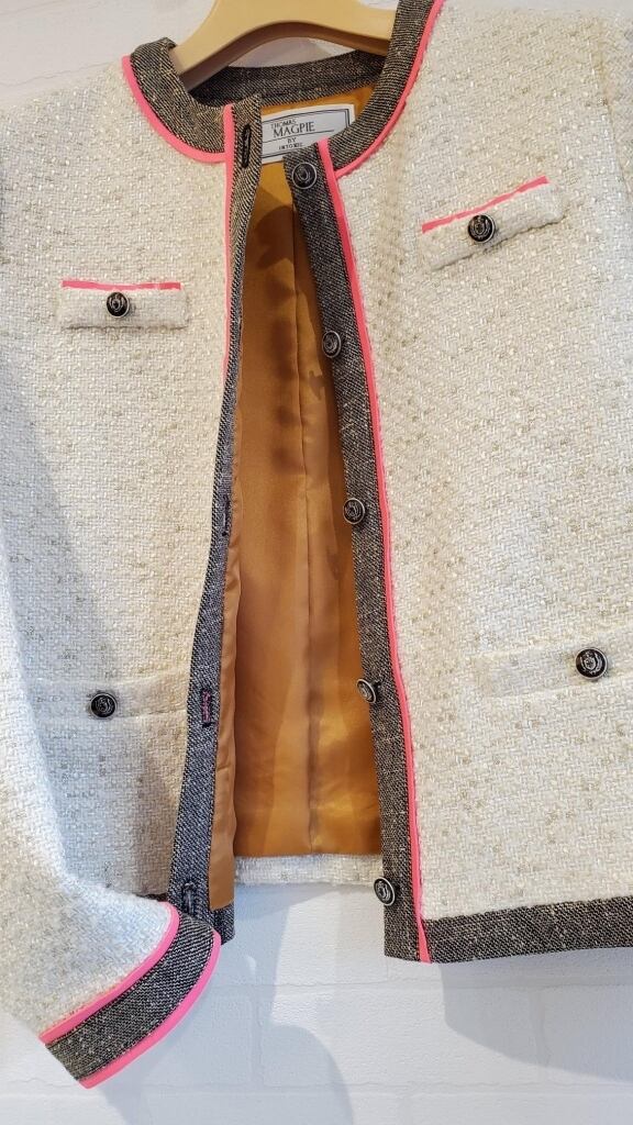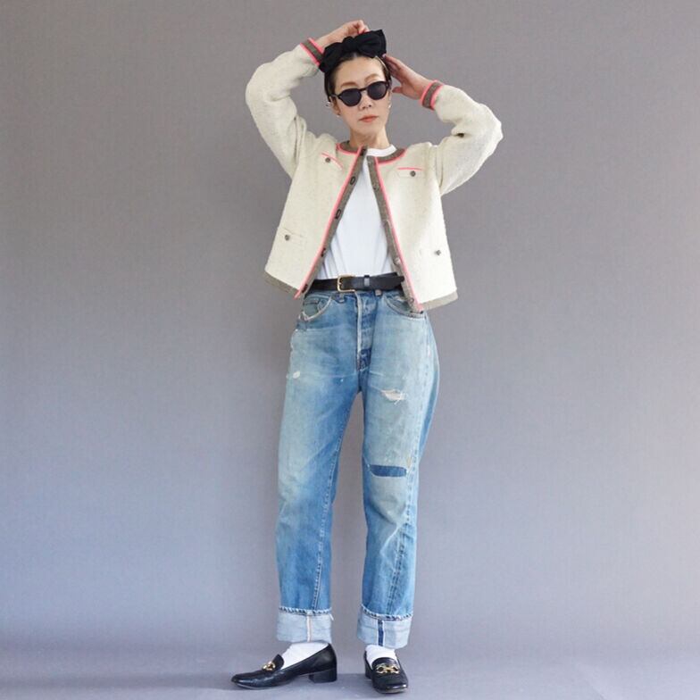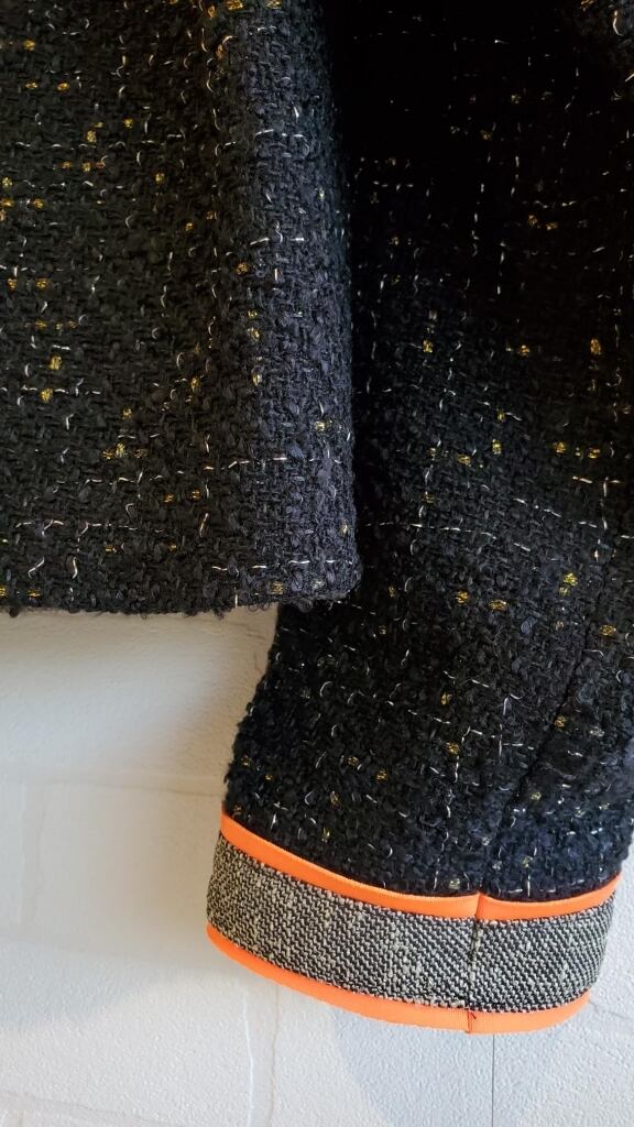 ゴールド糸を織り交ぜたツイードの身頃に、落ち着いたヴィンテージ感のあるふち。鮮やかに目を惹く蛍光カラーのラインを効かせて、クラシカルとトレンド感を絶妙にMIXさせた、他には無い特別なジャケットに仕上がっています。