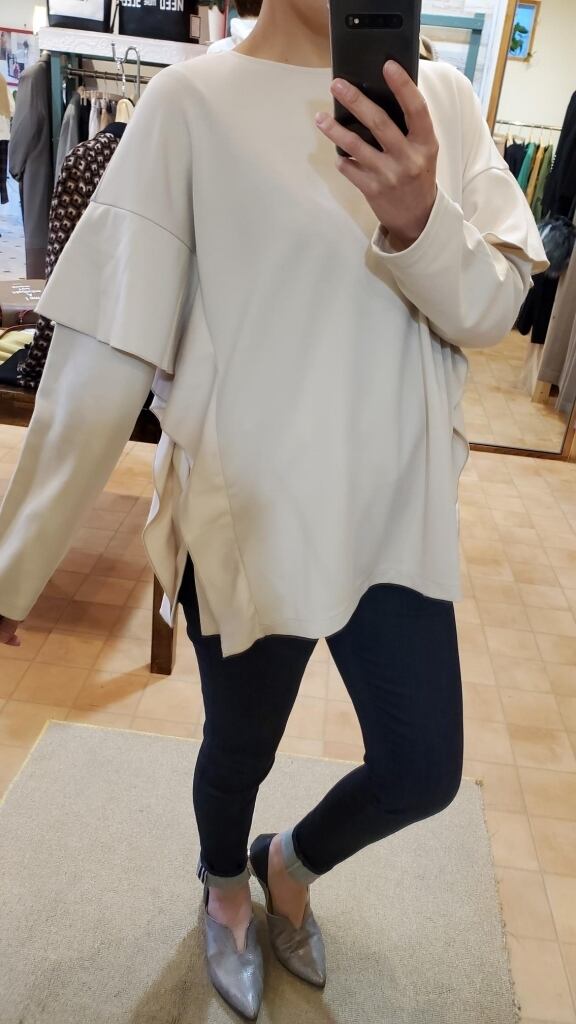 滑らかなポンチの素材が長いシーズンで活躍してくれるゆったりプルオーバー。