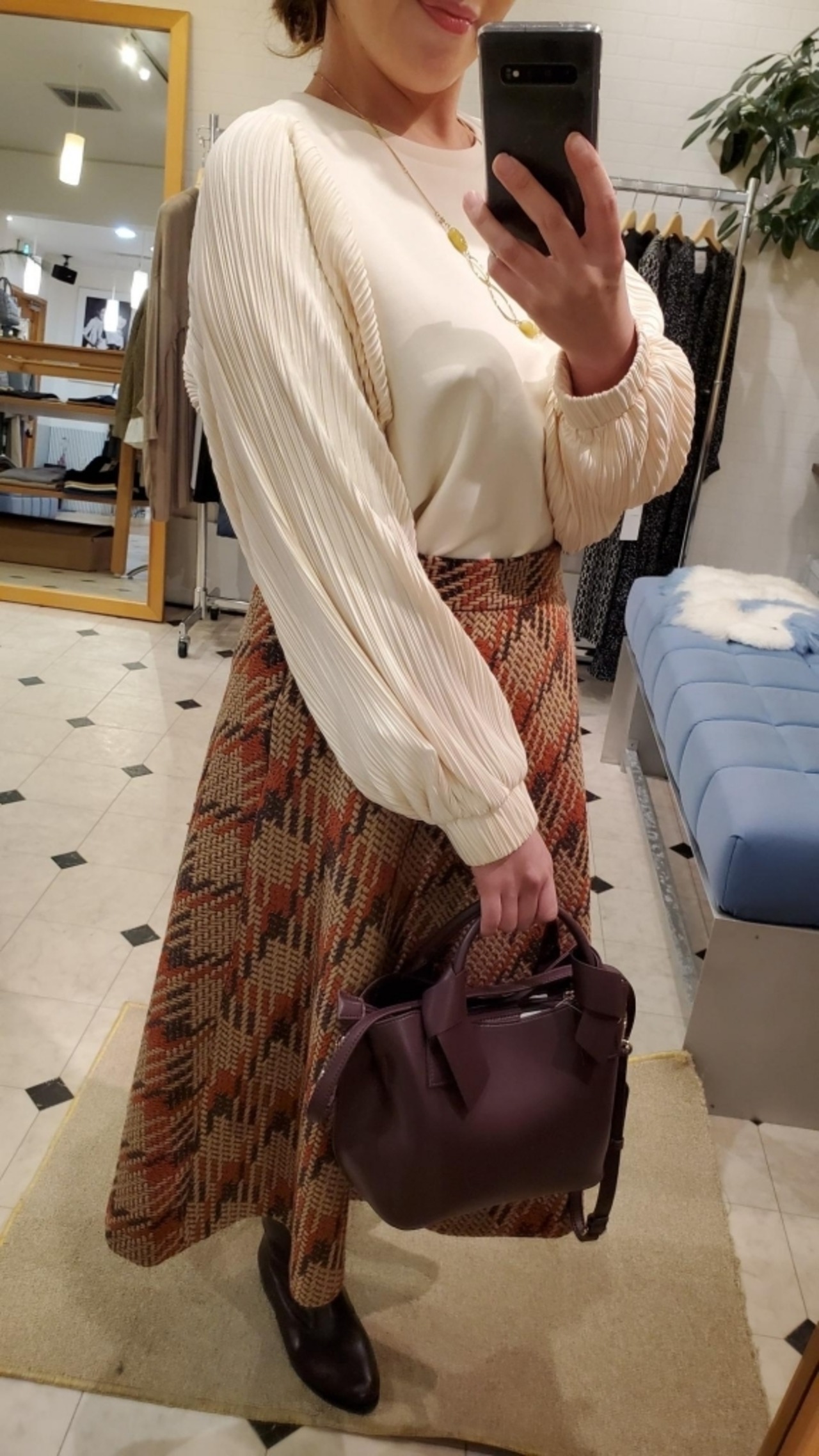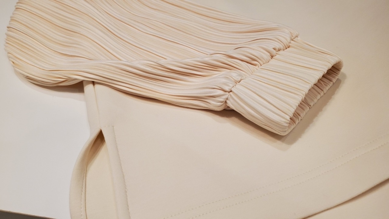 お袖にたっぷりと入った細プリーツで、ほんのりボリューム感があって可愛く着れるプルオーバーです。ツルンとしたダンボールニット生地ととろんだお袖のMIXですので、長いシーズンで着用できるおすすめの素材感です。