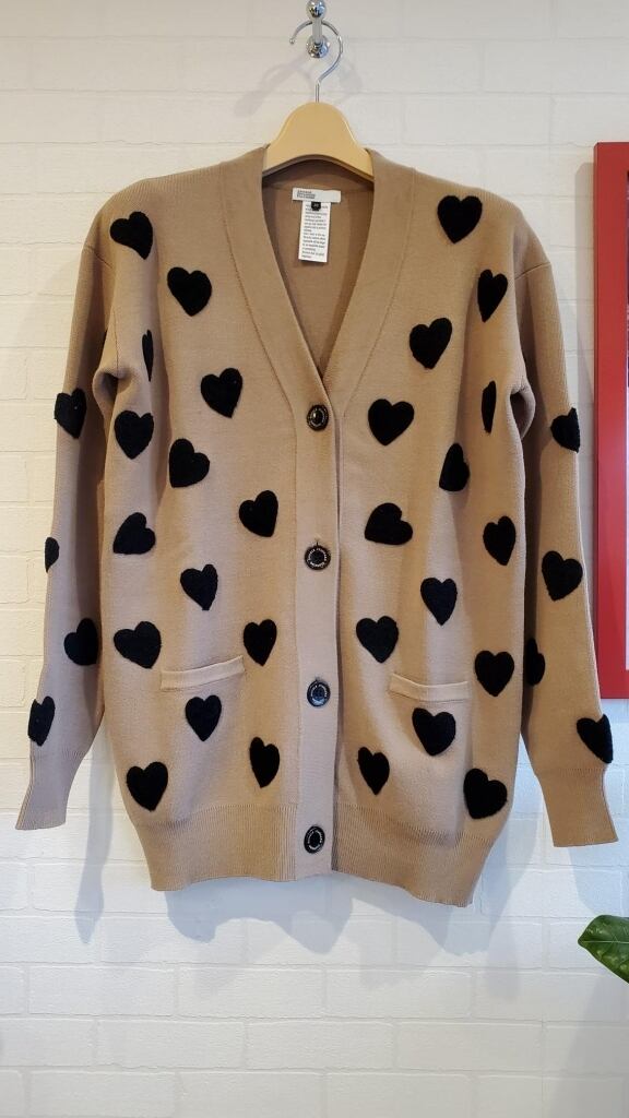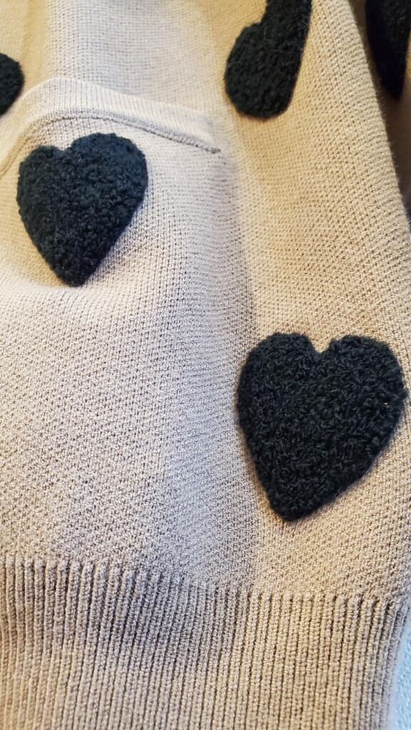 チクチクせず心地よい伸びの上質ニット[SNOWY]のカーディガンに、もこもこサガラ刺繍のハートを散りばめた、コーディネートを見映えさせてくれるカーディガンです。