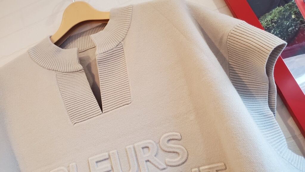 フロントのエンボス加工されたロゴがアクセント、今年旬のニットベストです。