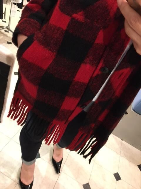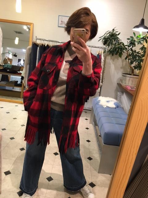 ふわふわ赤チェックと裾のフリンジで、気分の上がるアウターになってくれそうです。