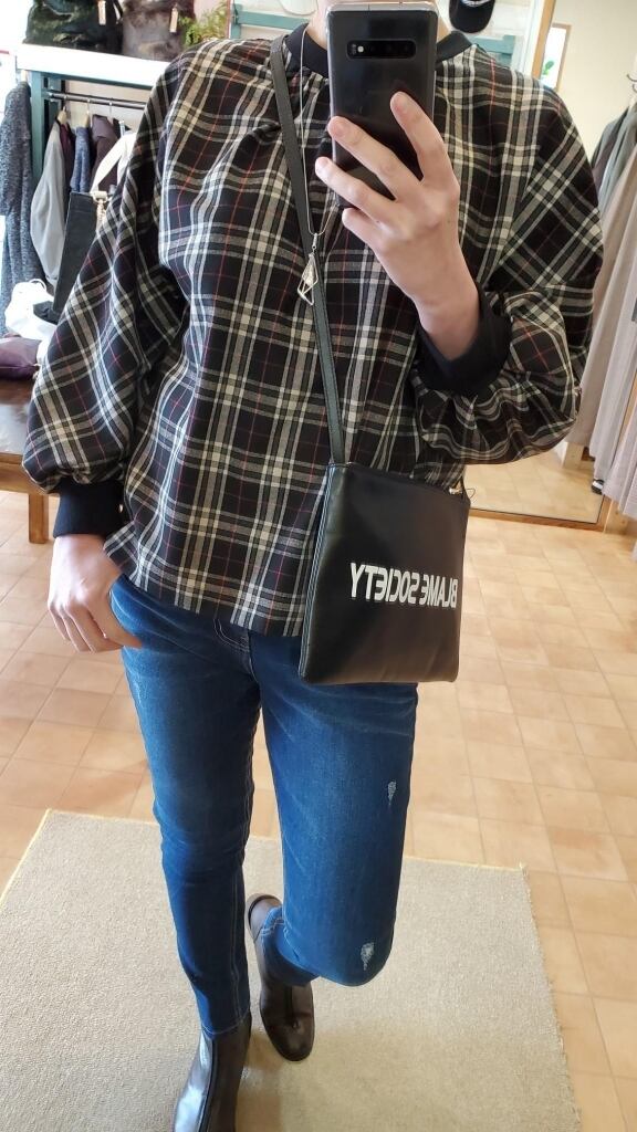 ほんのり起毛掛かったストレッチポンチ生地の、暖かチェック柄プルオーバー。お袖のふっくらが大人可愛いデザインです。