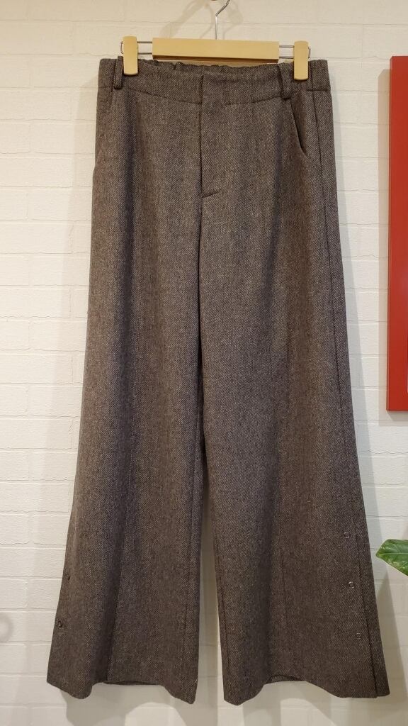 厚さの程よいエコツイード素材を使用した、上品なワイドパンツ。裾両サイドのボタンでスリットを調節して、ほんのりフレアなシルエットでも楽しめるデザインです。