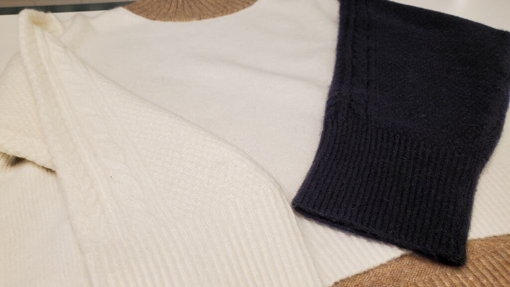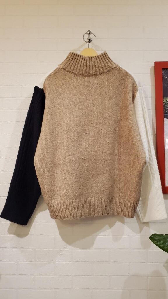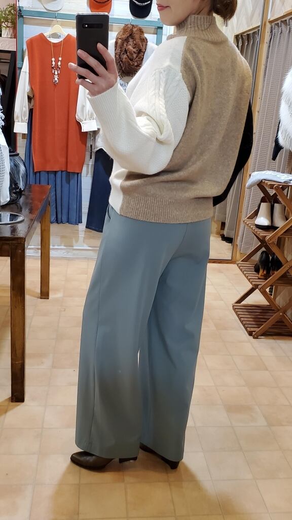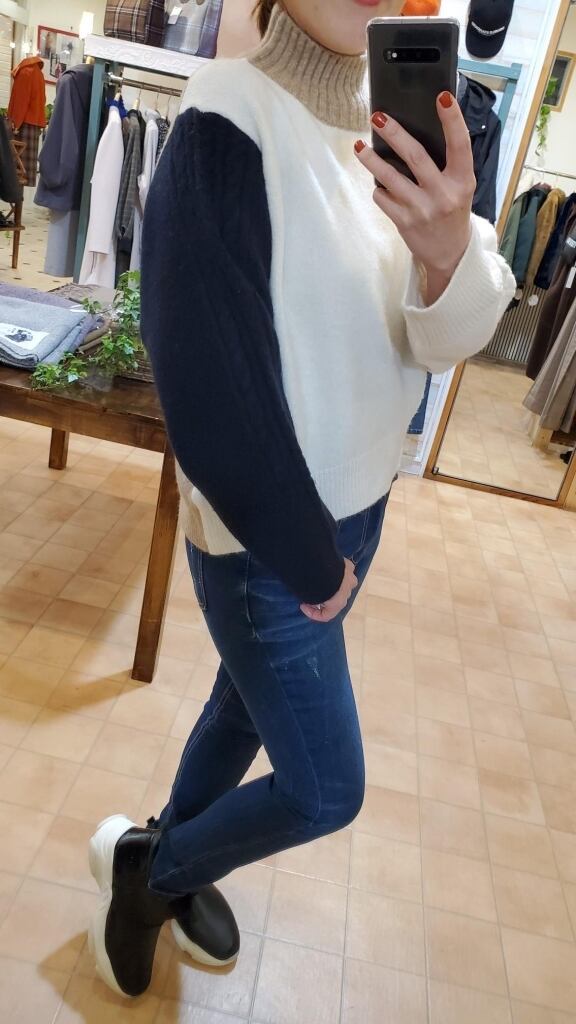 身頃、お袖、後ろに3色のお色を切り替えたニットプルオーバー。ふんわりモチっとした質感で重くなく、軽~い着心地です。