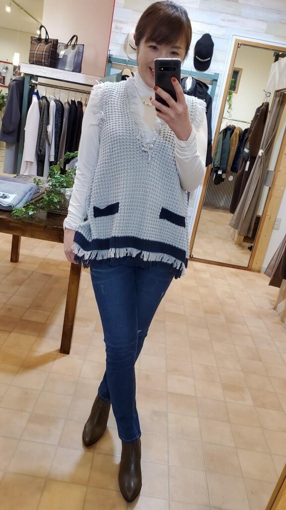 フリンジなどで遊び心がありつつ、Aラインや深Vネックで女性らしさも兼ね備えた、大人のニットベストです。体型カバーだけでなく、シンプルスタイルのアクセントにも。