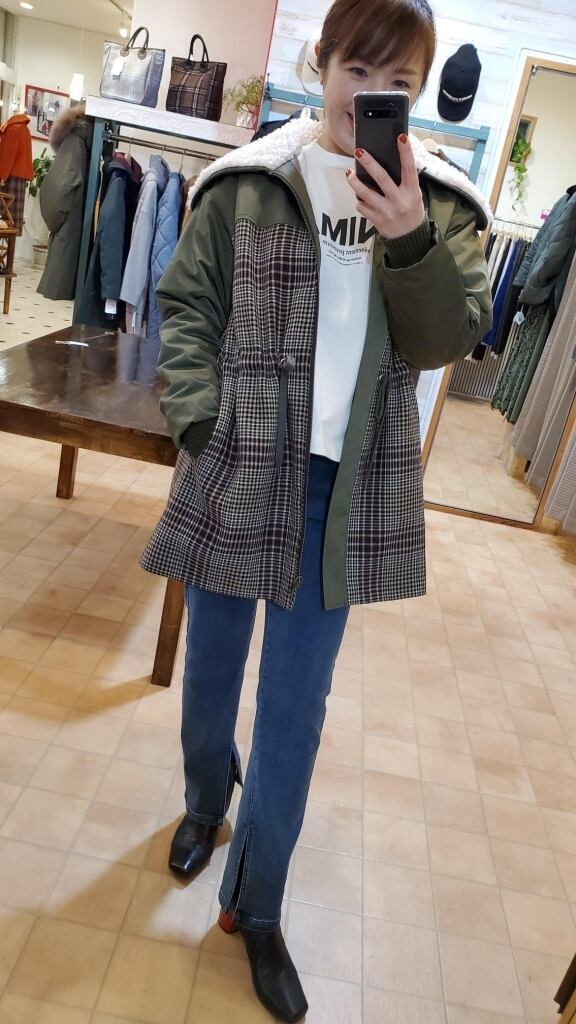 ボアの衿やウールチェック柄の切り替えで、パッと目を惹く見映えコートです。