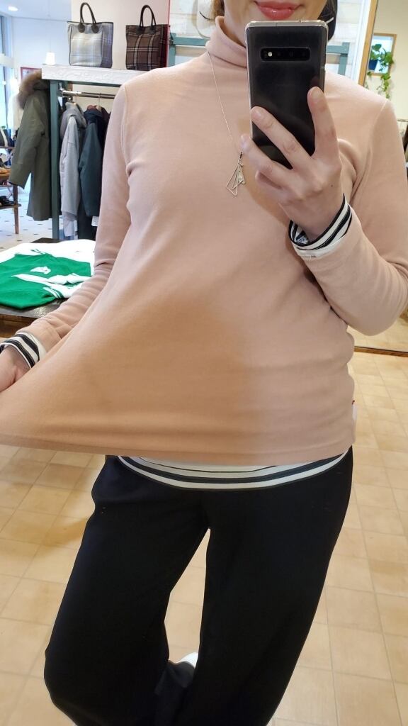 お肌を明るく見せてくれるピンクのお色で、羽織のインナーにも柔らかな印象で取り入れられますよ。