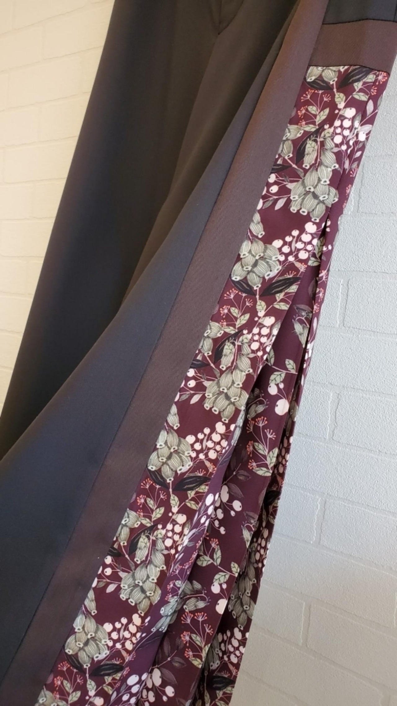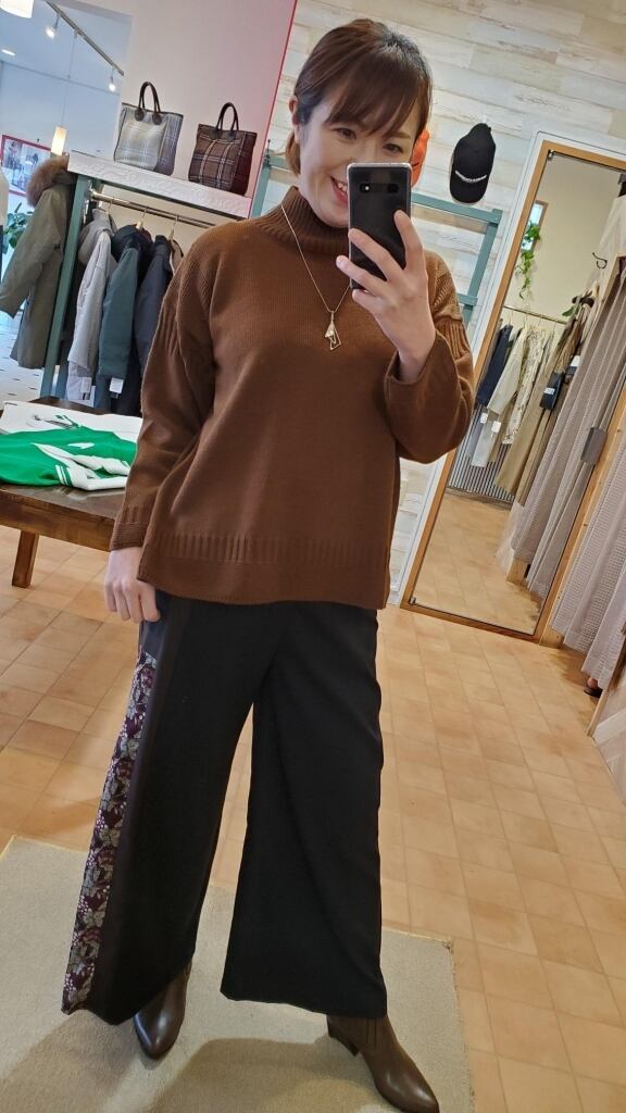 左サイドにラインとボタニカルプリント生地を切り替えた、シックな見映えの大人ワイドパンツです。