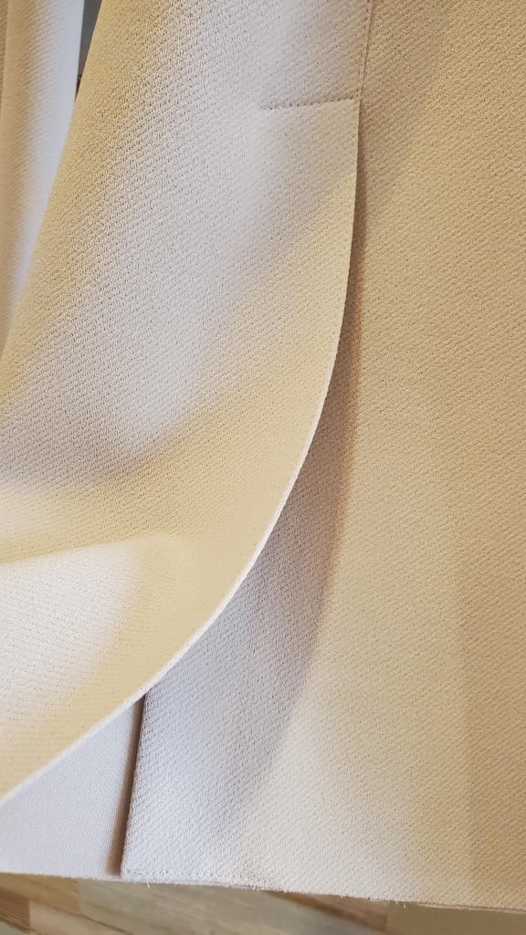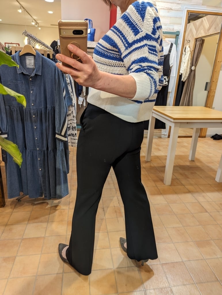 センターの切り替えの縦長ラインと、フロントスリット効果で美脚見えが絶大のパンツです。