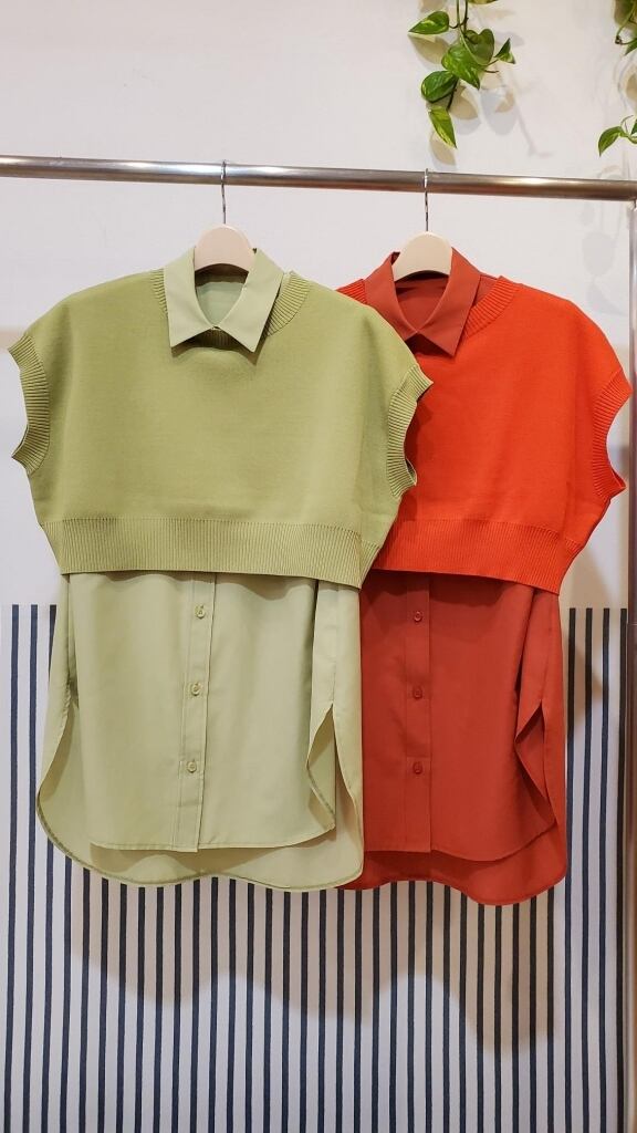 Tシャツ、ブラウスなどのレイヤードスタイルに、パッと明るいお色で華やぎます。