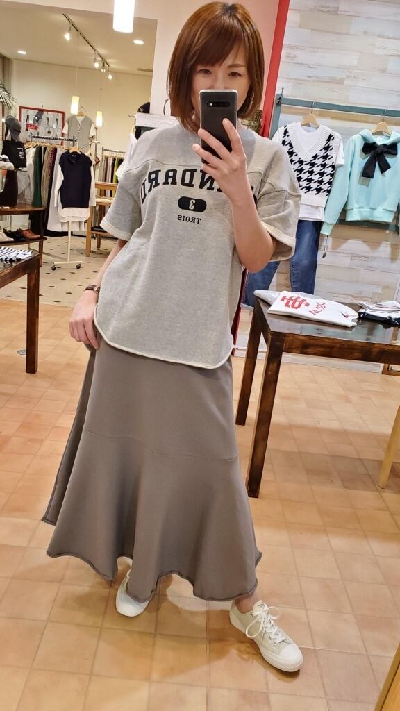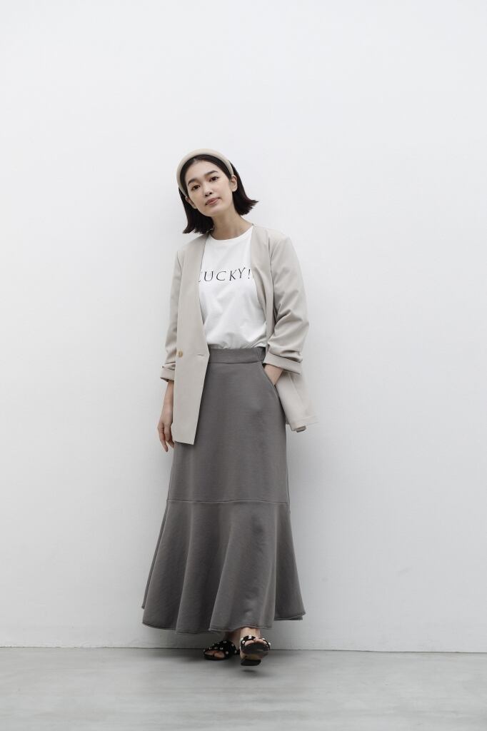 マーメイドラインで女性らしいフォルムを作ってくれますので、裏毛でもカジュアルになり過ぎず、大人のカジュアルスタイルに仕上がります。