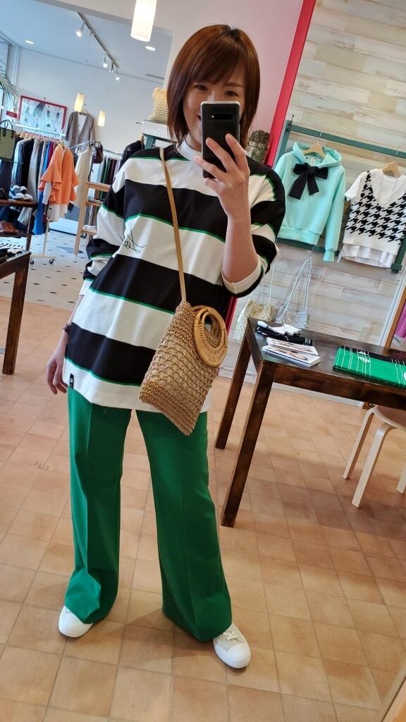 太いボーダー幅にグリーンを効かせて、配色がポイントに☆