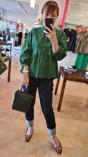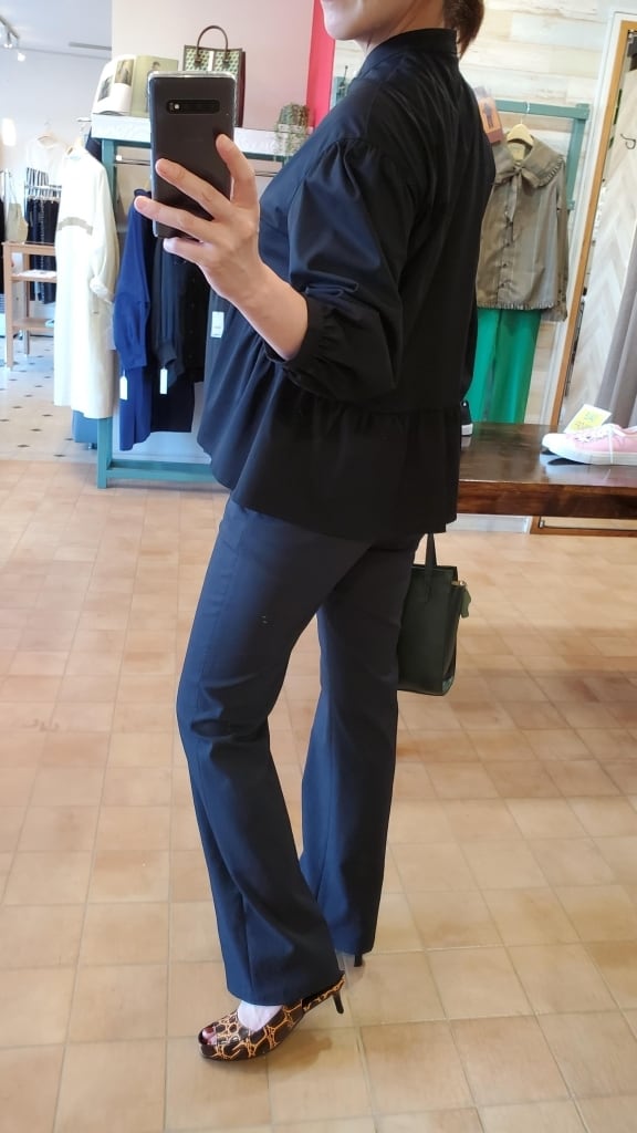 胸元のパールボタンとふんわり女性らしいお袖、スタイルアップ効果のあるペプラム切り替えなど、一枚で品良くポイントになってくれるこだわりが盛りだくさんです☆