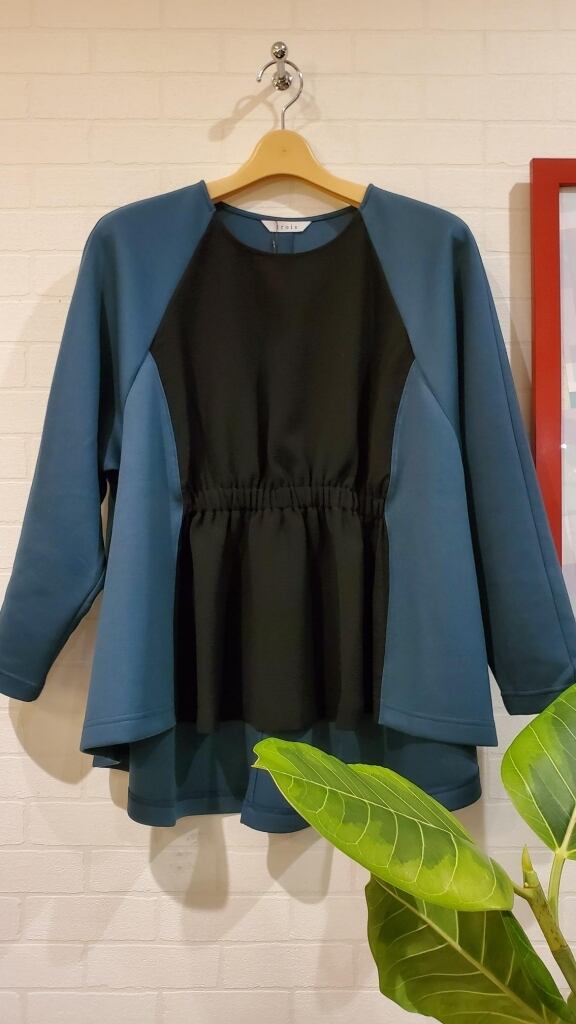 前の切り替えポンチ生地は凹凸のある生地で表情豊かに。さらに胸下のシャーリングデザインでスッキリ、女性らしく楽しめるんです。