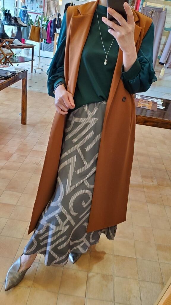 シルエットは女性らしく楽しめるマーメイドライン。サラリとしたポリエステルの素材感ですので、長いシーズンで活躍してくれます。