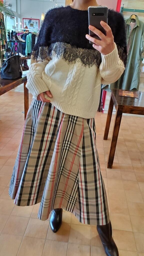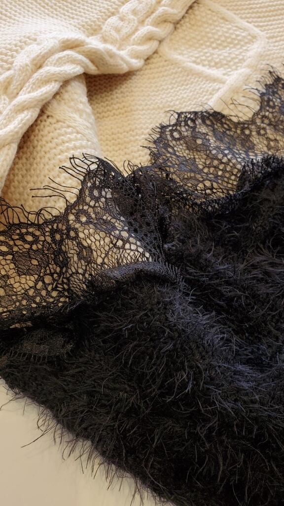 ふわふわシャギーとレース、ふんわり軽いケーブル編みのニットの切り替えで、一枚着るだけでフェミニンな雰囲気が完成してくれる素敵なニットです。