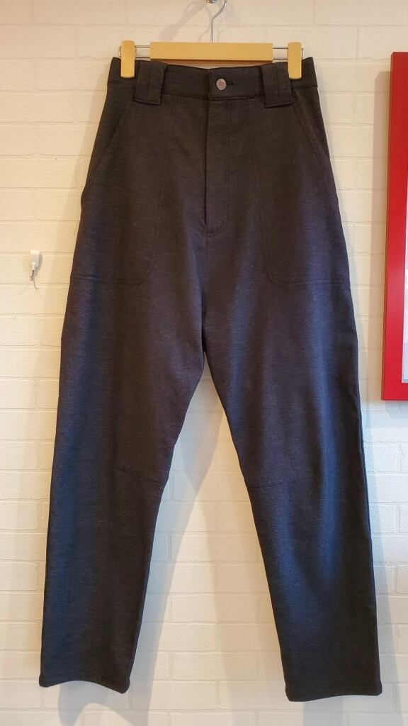 股部分に分量をたっぷりとった生地を、お膝内側に入ったステッチにかけてスッキリとカットした技ありシルエットです。