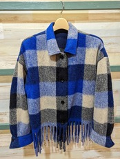 ブルーの大きめチェック柄と裾のフリンジが印象的なブルゾンです★