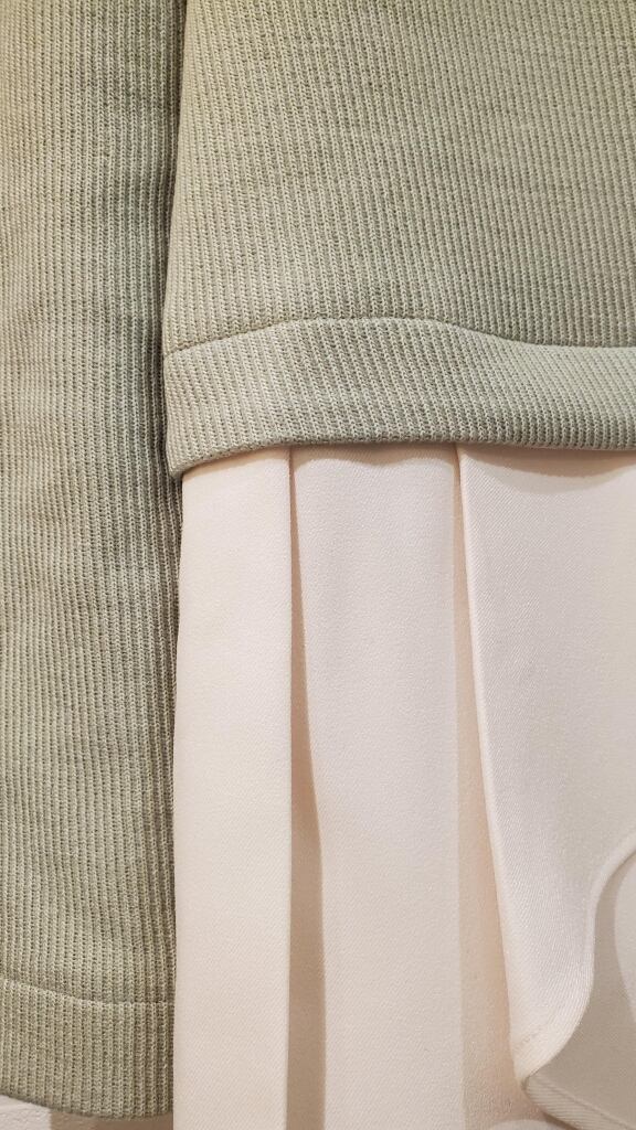 表地はニットのようなリブ編み、裏はコットンポンチ素材で、ウォーム感と肌当たりの良さが魅力のダブルフェイス仕立てになっています。