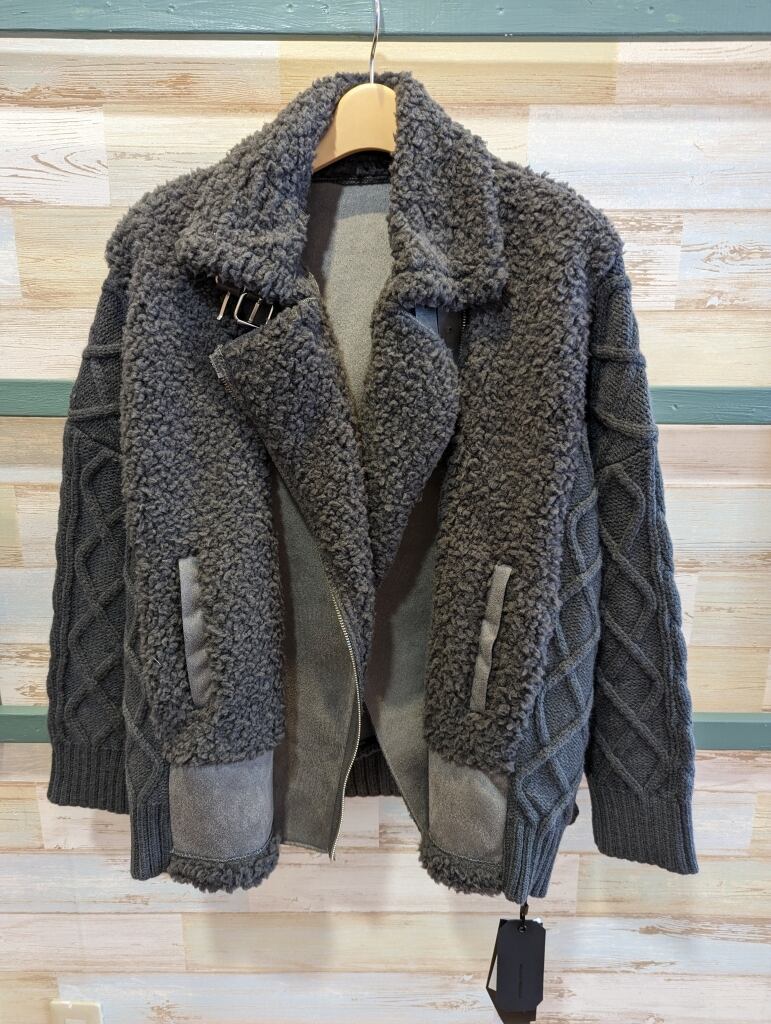 ふわふわボア、ケーブル編みニット、フェイクスウェードを切り替えて、可愛さとライダースのカッコよさをMIXさせた遊び心たっぷりなアウターです。