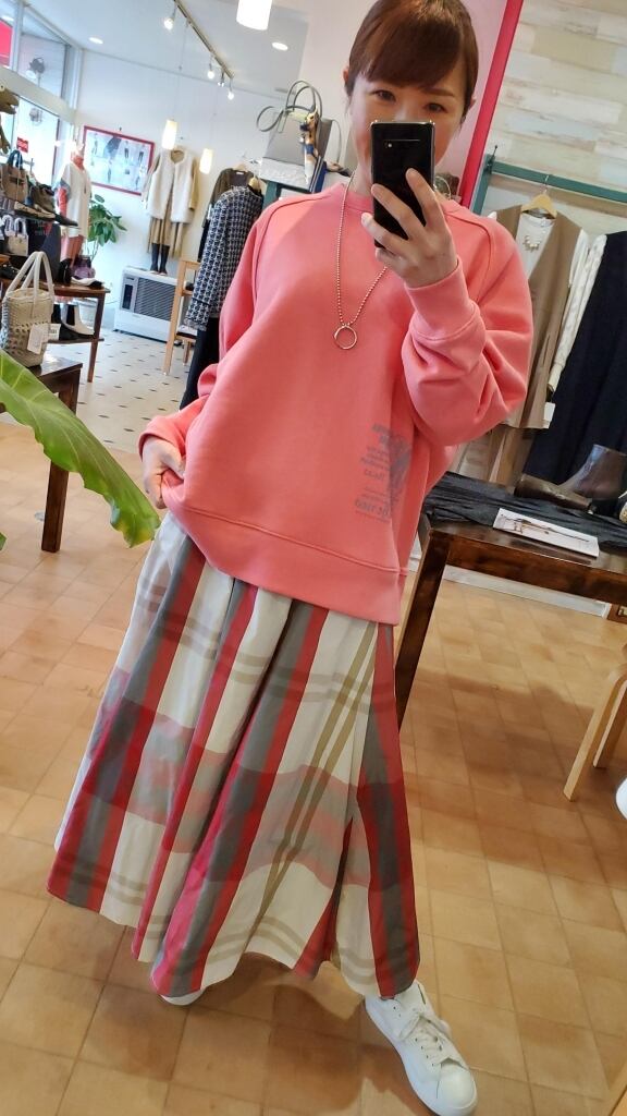 明るめのピンク、イエローなど気分の上がるカラーも加わり、見映えのするオシャレなスウェットコーデを楽しめます。