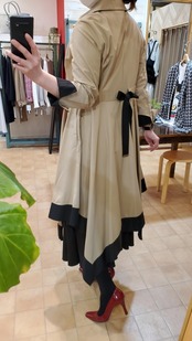 ウエストの切り替えからスカートのように広がるフレアラインやバックリボン、アシメトリーで存在感のある裾で、周りの目を惹く褒められアウターに♪