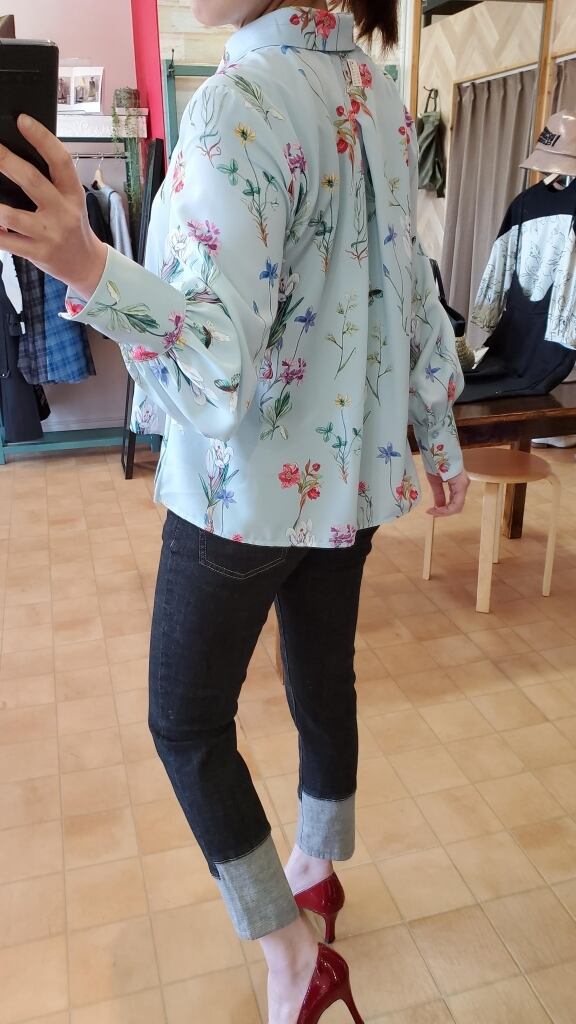 カラフルなオリジナルフラワープリントが華やかな、春の気分高まるブラウスです☆