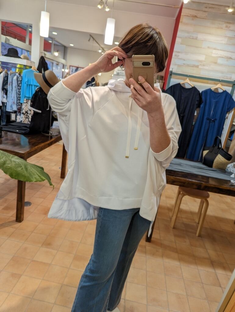 厚地ではないので羽織り合わせも可能。どんなパンツにも合わせやすい万能プルオーバーです。