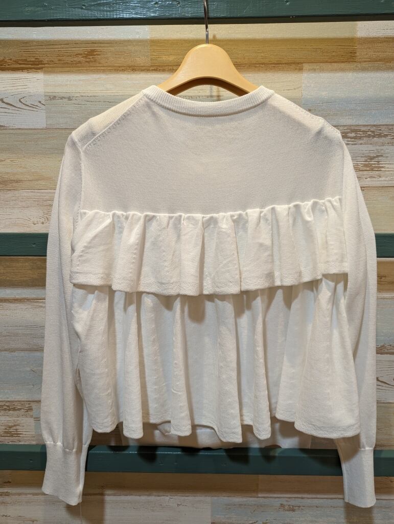前身頃は丸襟のシンプルなデザインですが、後ろには二段のティアード仕立てになっていて女性らしい可愛さミックスのカーディガンとなっております。