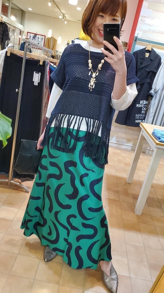 筆で描いたようなオリジナルのプリントと鮮やかなグリーンの発色が印象的なスカートです☆