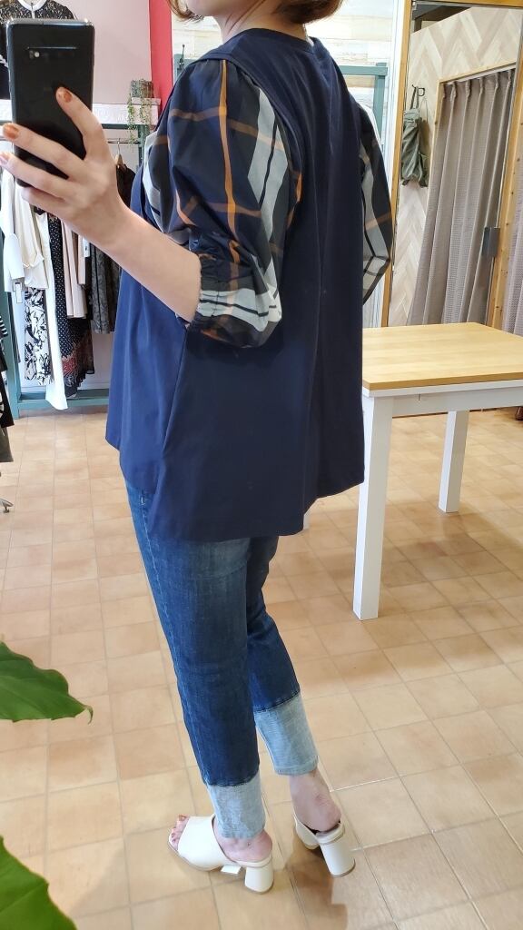 お袖にチェック柄の布帛生地をドッキングさせた、一枚で見映えが叶う七分袖プルオーバーです。