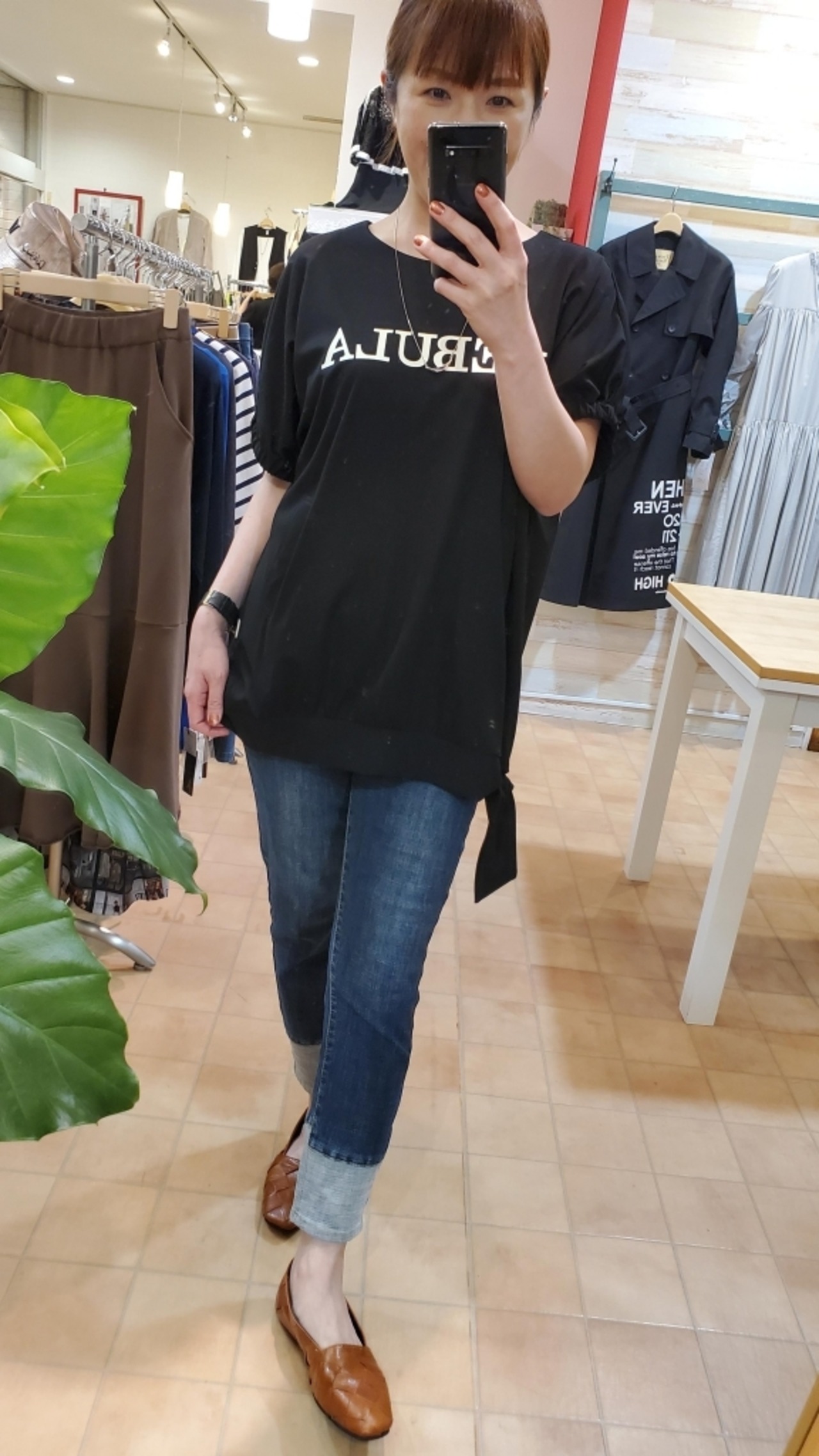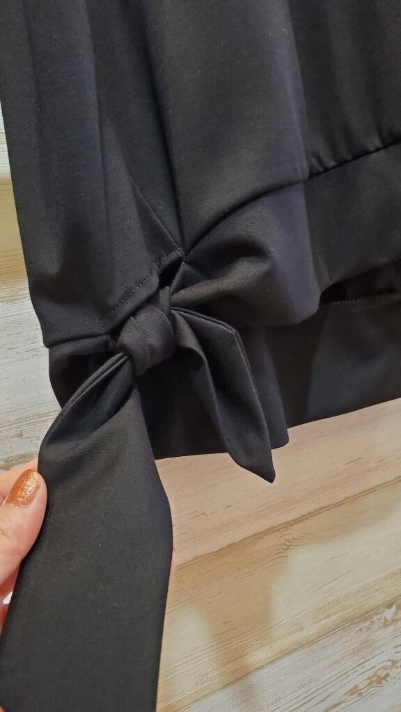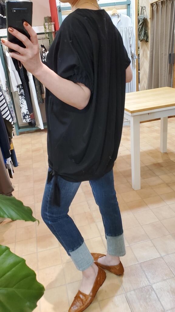 お袖のゴムや裾の結びでまあるい女性らしさのあるシルエットが魅力。素材にほんのり艶感がありますので、Tシャツスタイルもカジュアルになりすぎずに楽しめます。
