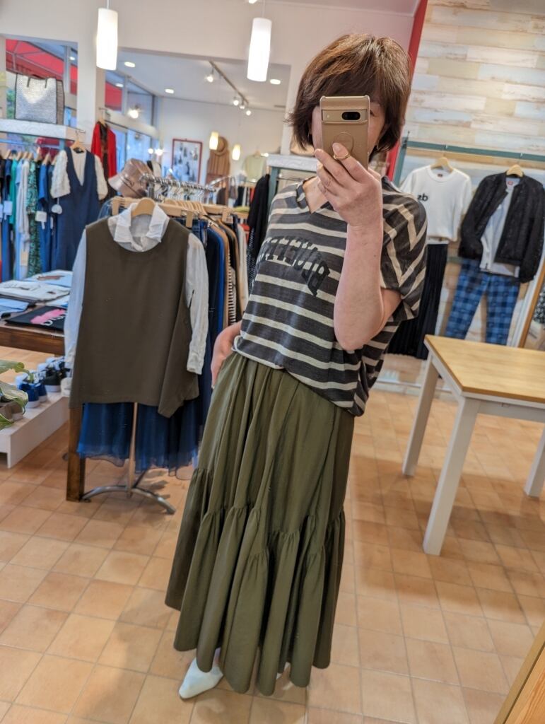 普通のティアードスカートに比べふんわり感が抑えられていますので、甘すぎずに女性らしいスカートスタイリングが楽しめますよ☆