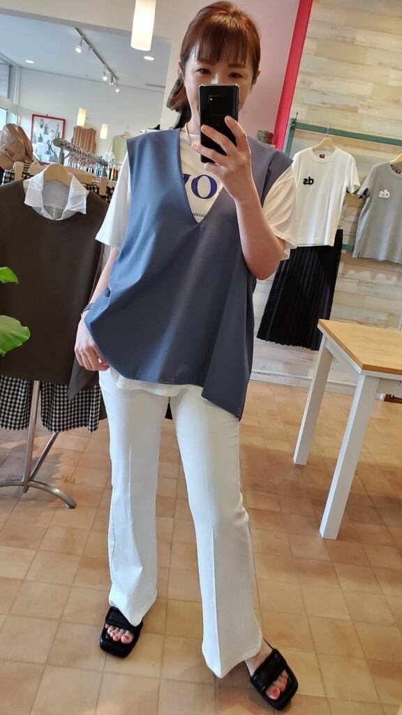 <CHIGNON>配色肩タックベストは、Tシャツに一枚加えるだけで、体型もカバーしつつお洒落度もぐんとアップしてくれます。