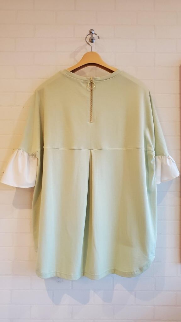 身頃はゆったりフレアシルエットのカットソー素材でとっても着やすく、薄手のタフタ素材で綺麗に形の出るお袖がポイントです。