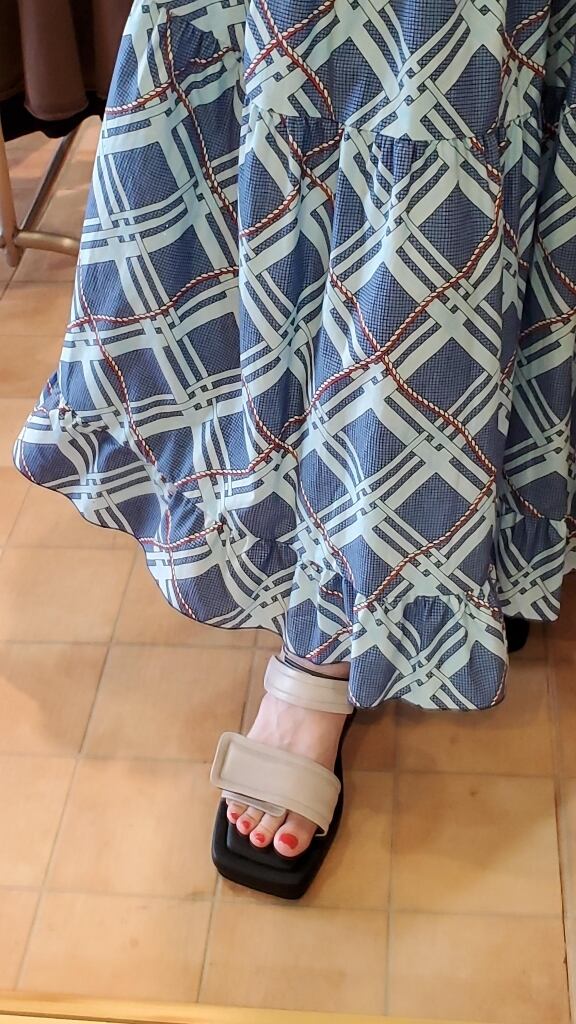 ブルーベースで赤をポイントにした、特別感たっぷりな爽やかチェック柄。コットンタイプライター素材で、美しいティアードシルエットも出ますし、夏も涼しく着用できます。