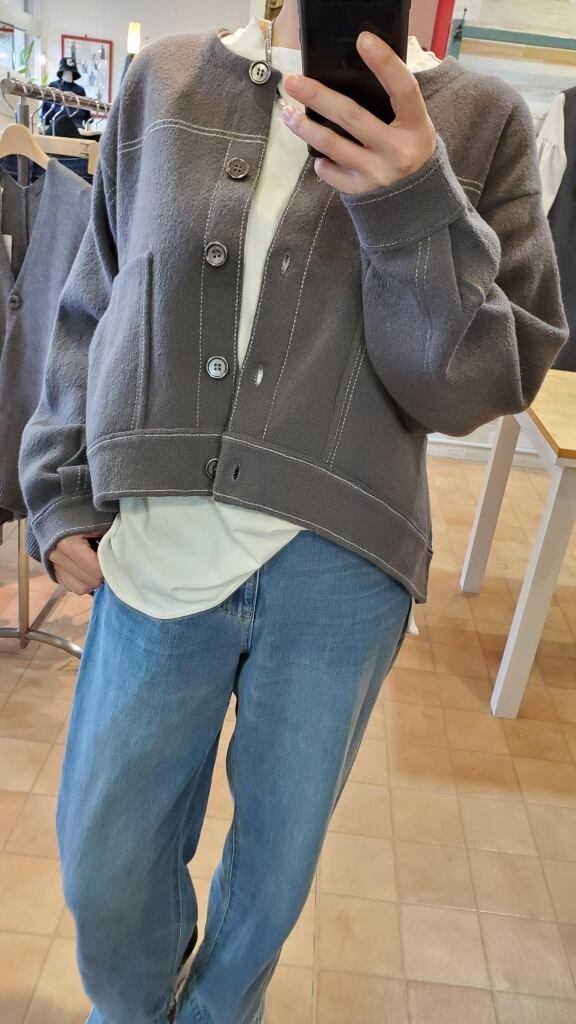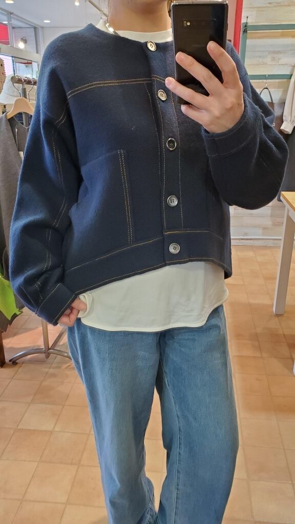 ノーカラーのデニムジャケット風にデザインされたニットブルゾンです★