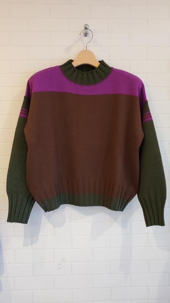 ほんのりレトロな雰囲気の独特の配色が目を惹くプルオーバーニットです。
