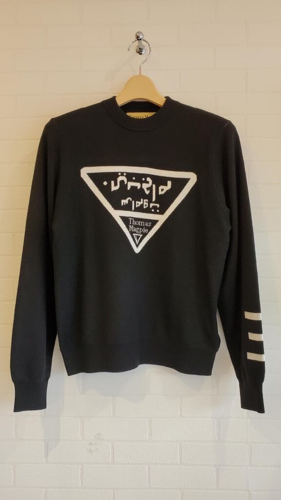 アラビア文字で表現された胸元のロゴ使いがアクセントになるニットです。