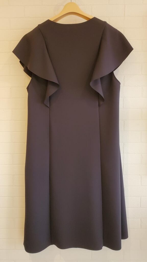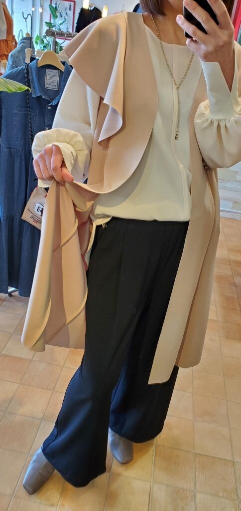 滑らかスムースなポンチ素材に切りっぱなしの縁使いで、ボディラインに程よく添うシルエットと美しく流れる女性らしいフリルが印象的です。