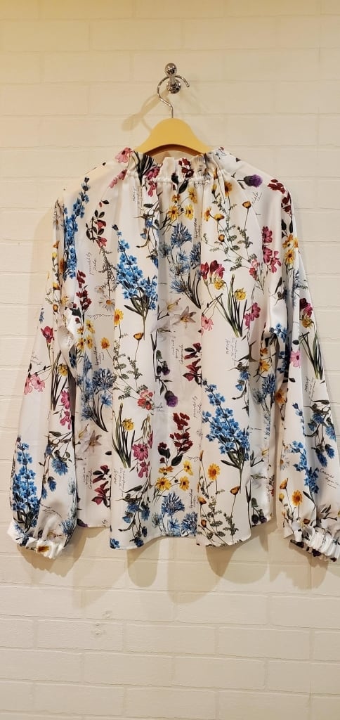 色とりどりの花柄プリントが華やかさ満天のプルオーバーブラウスです。