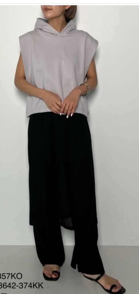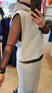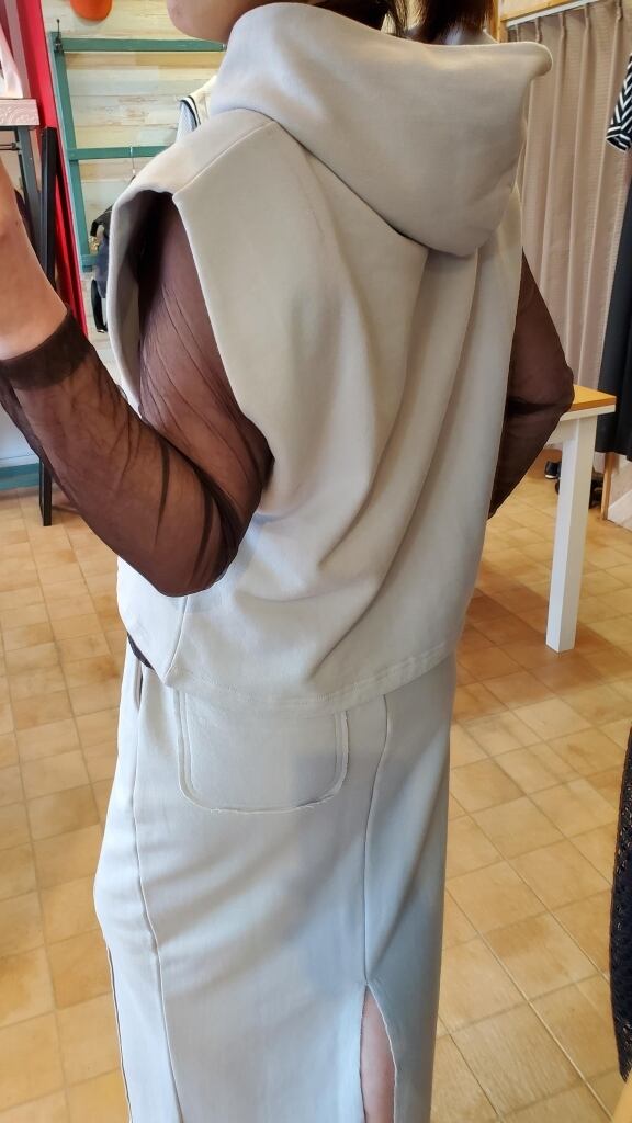 シンプルながらオシャレさを加えられる<シニヨン>のフーディベストです。
