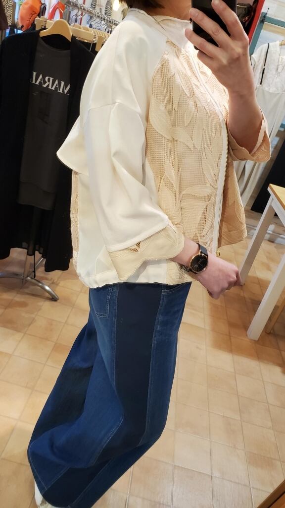涼し気なカット刺繍レースを切り替えたジップブルゾンです。