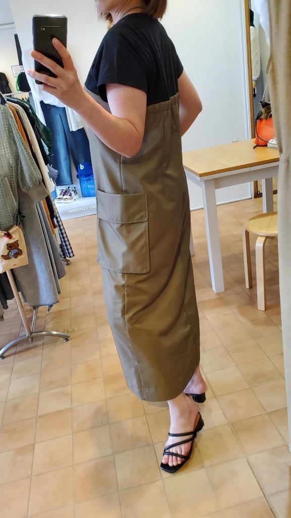 切り替え布帛の生地は艶のある上品見えする素材をチョイス。立体ポケットなどでワークデザインにしながらも、綺麗めに楽しめるワンピースです。