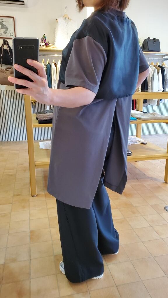 身頃はカットソー素材ですのでTシャツのような気軽な着心地に。短丈のオーガンジー素材で視線を上げ、後ろの深めスリットがお洒落度をアップさせてくれるデザインになっています。