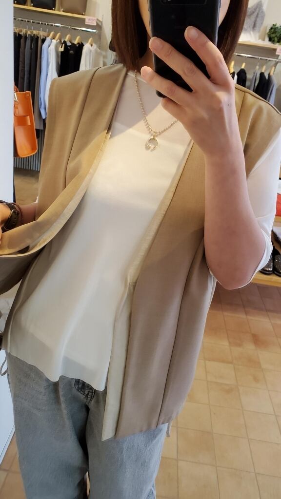 バックギャザーのフレアシルエットになっていますので、インナーを着て一枚でお洒落なシアートップスとして、その上にジレや羽織、サロペットなど重ねてどんどんレイヤードも楽しんでいただけます☆彡