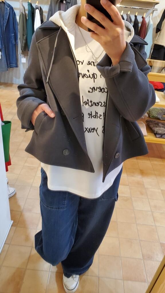 付けフードでカジュアルなレイヤードコーディネートのように楽しめるピーコートジャケットです。