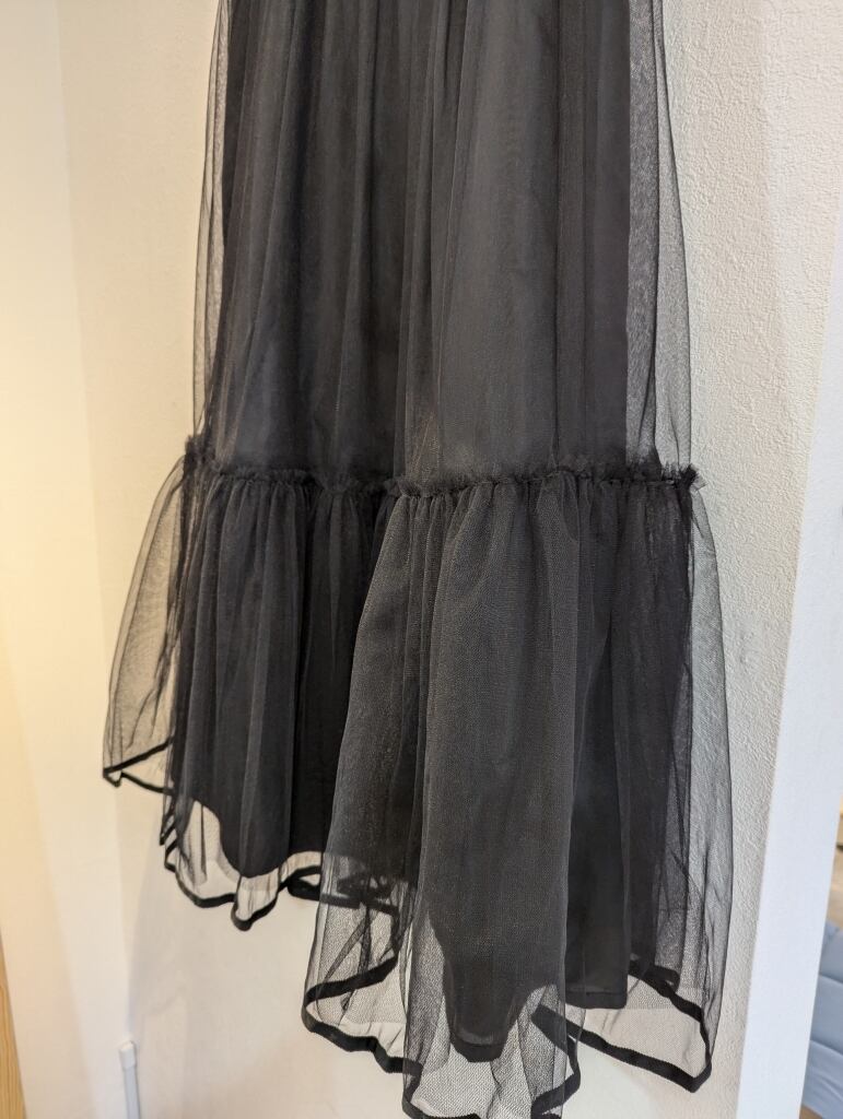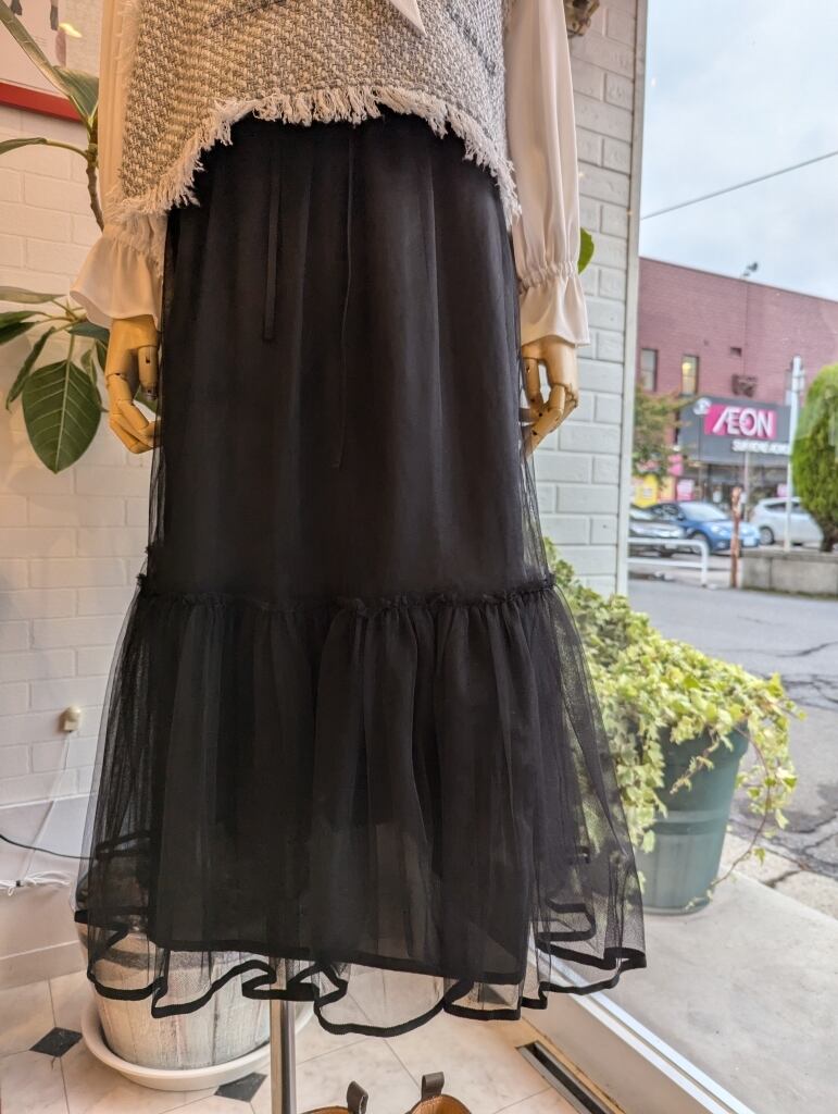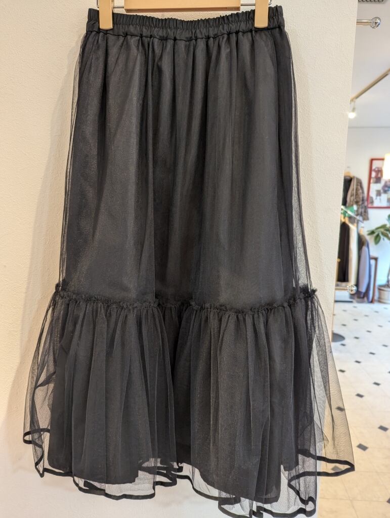 ソフトながらハリ感もあるチュール素材を贅沢に2枚重ねに使用し、大人が穿けるシルエットに仕上げたチュールスカートです。落ち着いたブラックカラーと裾のグログランテープが上品な印象に。ウエストは総ゴムのフリーサイズですが内側の紐を縛ればサイズ調整も可能です。
